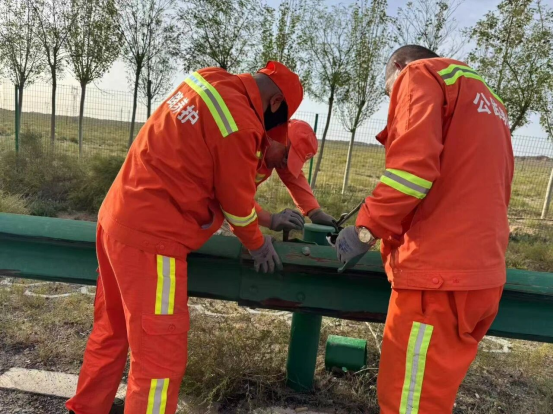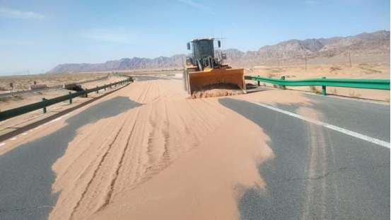针对秋季风沙天气频发,部分路段易出现积沙现象,以“大风后必清”的原则,配备装载机等设备,采用机械为主、人工为辅的方式,快速清理路面积沙并规范堆放到路侧安全区域,防止二次堆积,清理积沙积土24.98万立方米,保障通行安全。同时通过在公路两侧设置沙障、在易积沙区域种植梭梭、在孟根等重点路段进行草方格压沙2.37万亩等方式,切实做好“以路治沙”工作。