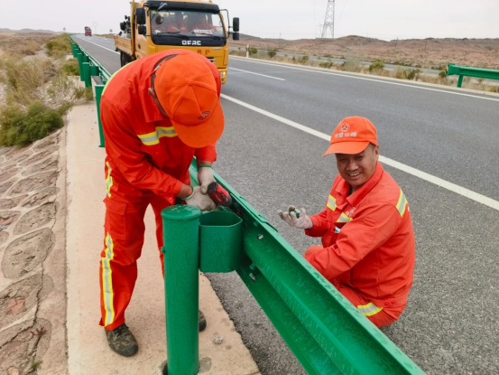 国庆期间,广袤戈壁的G307公路上,身着橙色工装的公路养护人“钉”在岗位上。他们或是专注维修护栏,或是合力安装里程牌,或是细致进行路面灌缝,在风沙与烈日中,用沾满油污的双手和执着的坚守,为万千旅客铺就了一条平安顺畅的国庆出行路。